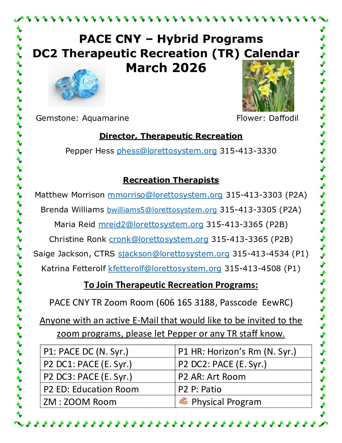 PACE CNY March Therapeutic Recreation Calendar – Sally Coyne Day Center